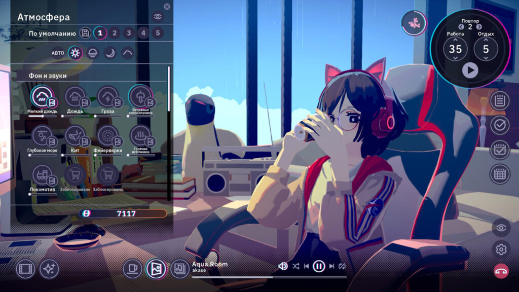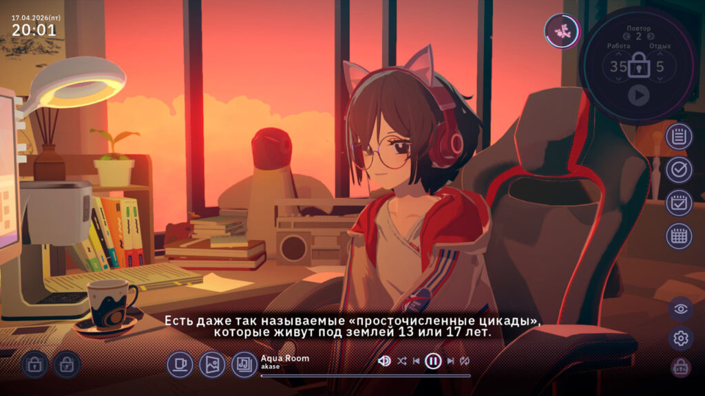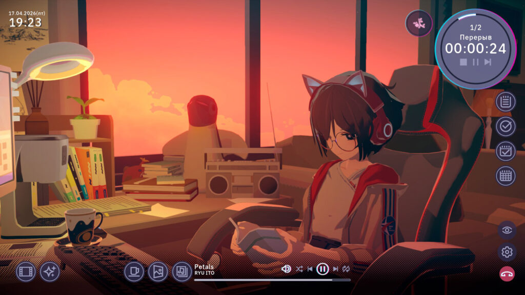 Но это всё техника. А у Chill with You: Lo-Fi Story есть ещё Сатонэ. Девушка с историей, планами, мечтами и увлечениями. После рабочих сессий она можешь рассказать что-нибудь о себе и своём мире. А если совместно проработать достаточно долго, будут даже специальные кат-сцены. То есть к примитивному помодоро-таймеру прикрутили целый сюжет. Прибавим лёгкую и ненавязчивую музыку (можно добавлять свою). А также возможность настраивать визуал: менять время суток и погоду за окном, модернизировать комнату и аксессуары Сатонэ. Для этого не нужно ничего докупать за реальные деньги — достаточно работать с включённым приложением.