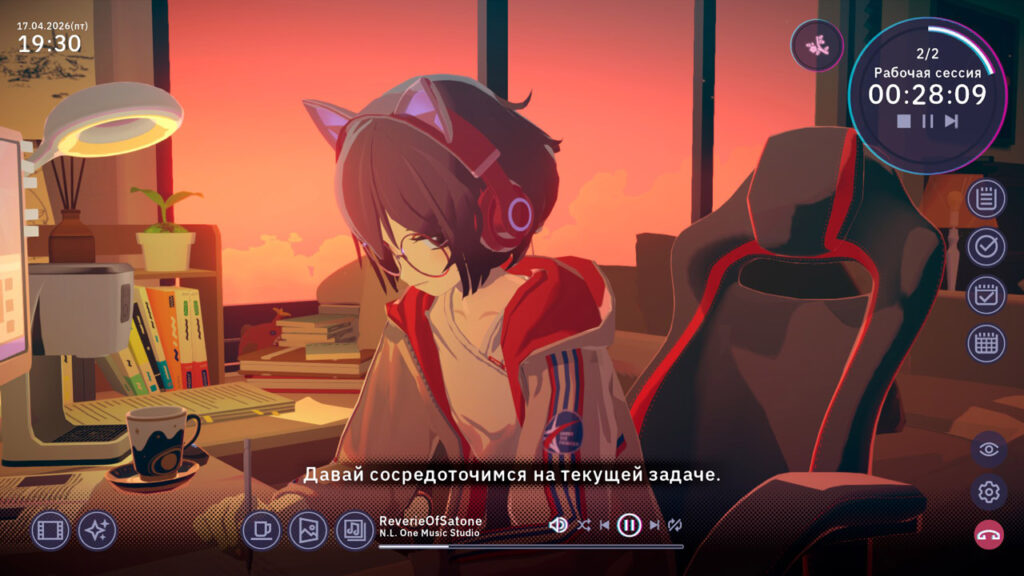В этот раз речь пойдёт не совсем об игре, ведь Chill with You: Lo-Fi Story — это приложение для организации своей рабочей среды и поддержания концентрации. Когда ты работаешь дома, или у тебя есть хобби, которое требует регулярной усидчивости, отвлекаться — это обычное дело. Не менее обычно засиживаться перед экраном и забывать делать перерывы. Кто поможет? Сатонэ поможет!